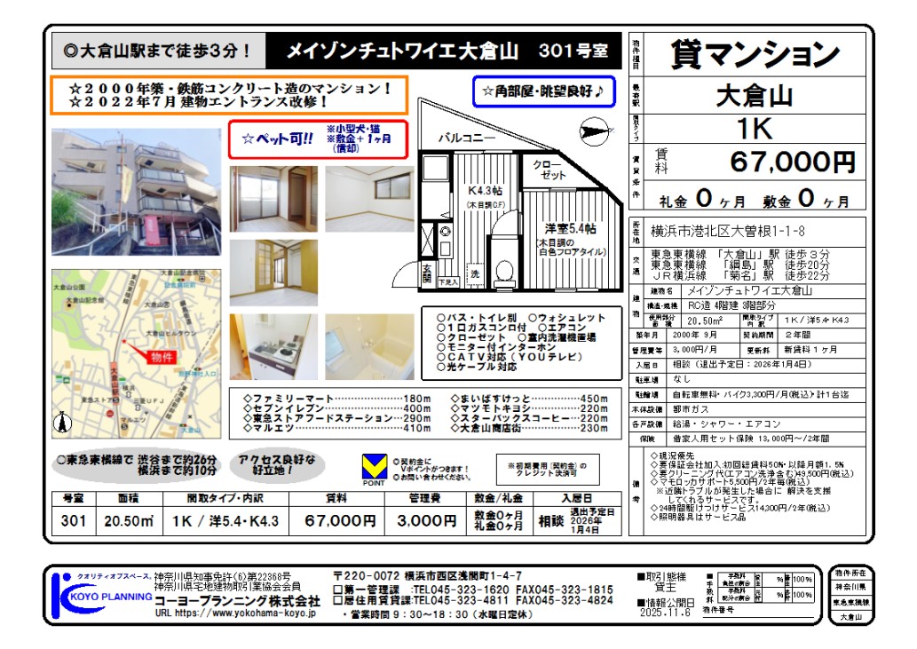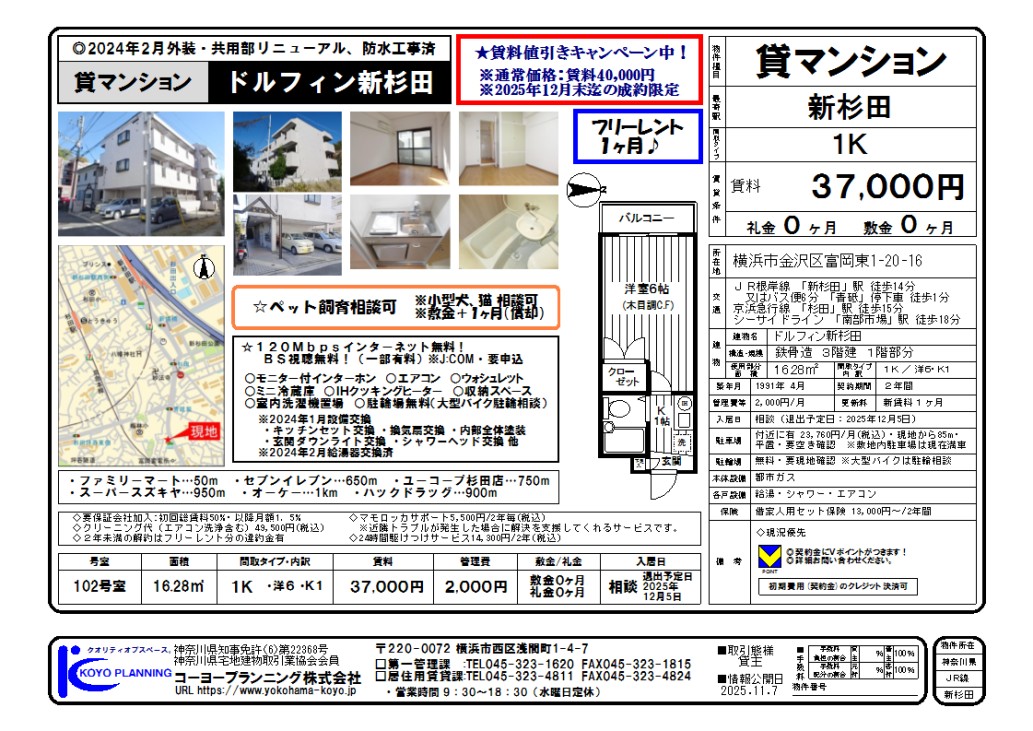 本格的な大規模リニューアル工事を実施中。オートロック・エレベータ新設。外壁、共用部の大規模修繕(9月末完成予定)。CATVの1Gbpsネット付。ペット可(小型犬・猫、敷金1ヶ月増、敷金1ヶ月償却)。
