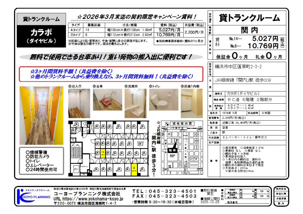 ☆3ヶ月間賃料半額!(共益費を除く) ☆他のトランクルームから乗り換えなら、3ヶ月間賃料無料!(共益費を除く)