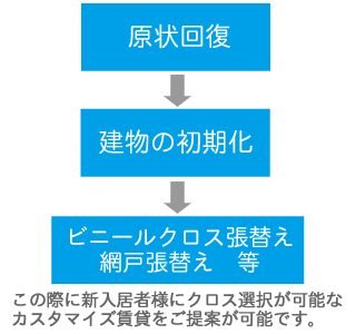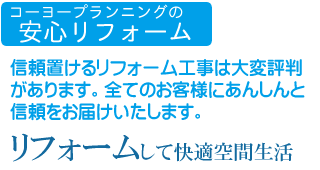 リフォームは=修復です。原状回復をし建物の初期化。ビニールクロスの張替え、網戸の張替え交換等まで全てフォローいたします。コーヨープランニングは大変丁寧におこないますので大変お客様よりご好評を承っております。